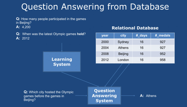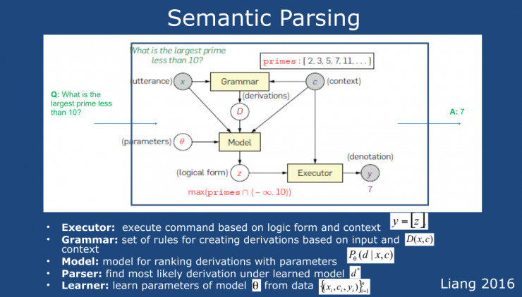 另外一个比较具有代表性的工作是 Percy Liang 在 2016 的研究。首先要有语法,语法通常是人定义的,通过语法产生多个解释;然后要有模型,模型也是事先学好的;再基于上下文选择最有可能的解释,转换为逻辑表达式。在这里,我们的思考是,现在是否能借鉴深度学习的想法,做一个端到端的系统,完全自动学到语言处理的编码器、解码器等。