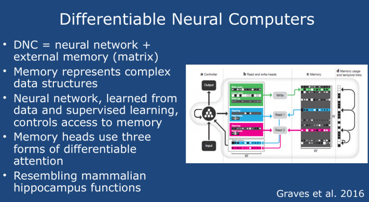 为什么很多人都关注长期记忆,因为长期记忆确实是现在几乎所有的人工智能系统所不具备的能力。现在也有这方面的研究,比较有名的就是 DeepMind 的 DNC(Differentiable Neural Computers)工作,这个工作也是在关注如何把知识用矩阵的形式存储在长期记忆里。这个系统里提出了三类不同的神经网络,这三种不同的神经网络实际上模仿了老鼠的海马体机理,目前对老鼠的海马体机制已经研究得比较透彻。
