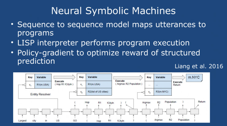 最近的最接近的工作是谷歌 16 年出的 Neural Symbolic Machines 模型,这个想法非常有意思,要做的事情也是问答,训练数据是大量的问句和命令,去学习 Sequence to Sequence 模型,可以执行复杂的计算机命令,找到答案。