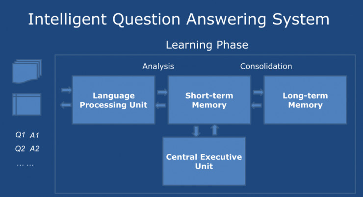 往下走智能问答系统应该是什么样的呢?畅想 5-10 年后的未来,有可能构建这样的智能系统,在这个系统中,有语言处理模块,包括短期记忆、长期记忆,系统能自己不断去读取数据,能把数据里面的知识做压缩表示,放到长期记忆模块。构建这样的拥有长期记忆的智能问答系统,这是我们现在的愿景。