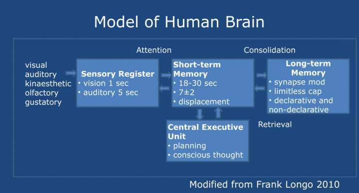 下面这幅图是斯坦福的一个脑科学家 Frank Longo 画的大脑的功能模型,他是从记忆的角度看的。大脑的记忆部分首先有感官,来感受到客观的信息,这种感官寄存器能记住外界传来的 1-5s 的信息,如果大脑感兴趣,就会记住大概 18-30s 的内容,如果对这个内容特别感兴趣,就能放到大脑的长期记忆里。