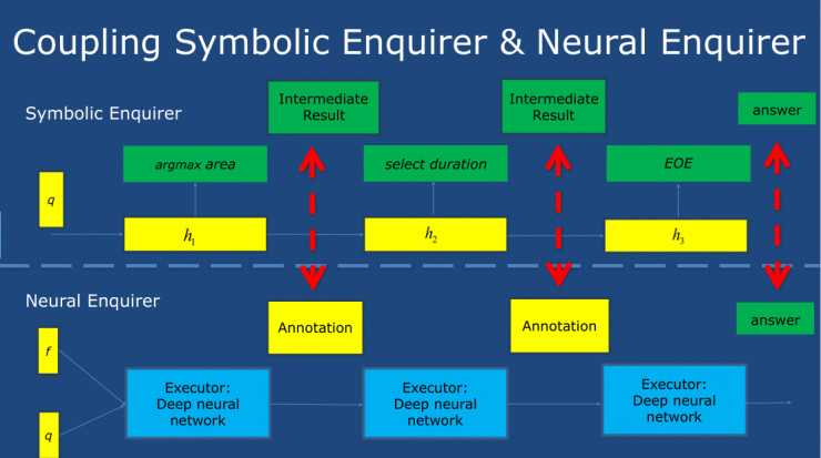 Symbolic Enquirer 的特点是操作的过程全是符号,底层全是用神经网络去做。用端到端就能构建这样的系统,不需要任何人的参与。假设有大量的语法,就能学习神经网络,自动产生命令序列,访问数据库找到答案。另外一个对应的想法是 Neural Enquirer,同样的问句,逻辑上也要执行三步,我们全部用神经网络去实现。这一块用到五个 executor。