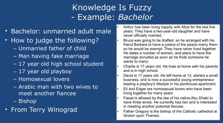 最后是知识概念的模糊性,比如 bachelor 的概念,它表示单身男子,但是未婚的父亲、假结婚的人等是不是可以定义为单身,大家的观点可能不一样。这与语言的多样性会有一定的关联,我们会对典型的单身男子的概念有个共识。