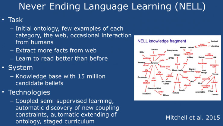 这样的工作业界已经开始在做。比如 2015 年提出的 Nell(Never Ending Language Learning) 系统,这个工作强调让系统看大量文本内容,自动学到知识。这个系统能自动在互联网上爬取数据、处理数据、抽取知识,加入到数据库。