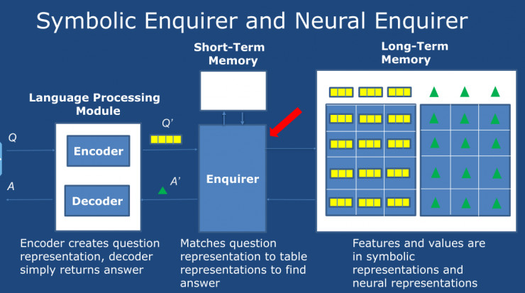 在自然语言处理中,深度学习在人的感知领域,比如说图像、语音方面比较成功,所以自然就会想到,能不能用神经符号的处理方法实现我们所说的智能问答系统。这样的智能问答系统,通过把神经处理和符号处理相结合,加上语言处理模块,沿用深度学习的概念,这里面包括编码器、解码器。在表示信息的时候,既有符号表示,又有神经表示,用词向量去表示单词。将符号表示和向量表示组合起来,产生一定的结构,更好地表示知识。