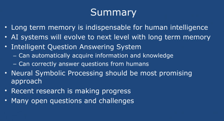 下面我做一个简单的总结,今天我们畅想的是自然语言的未来,希望未来自然语言处理系统能慢慢实现长期记忆,能把深度学习和符号处理结合起来,发挥两者的优势。同时,我们也要更多地参考人脑的信息处理机制,未来把自然语言处理推到另一个高度。考虑有这样的智能问答系统,能看大量的文献,知识库,读取到重要的信息知识。目前业界正在做很多的相关工作,相信这在未来会是一个重要方向。