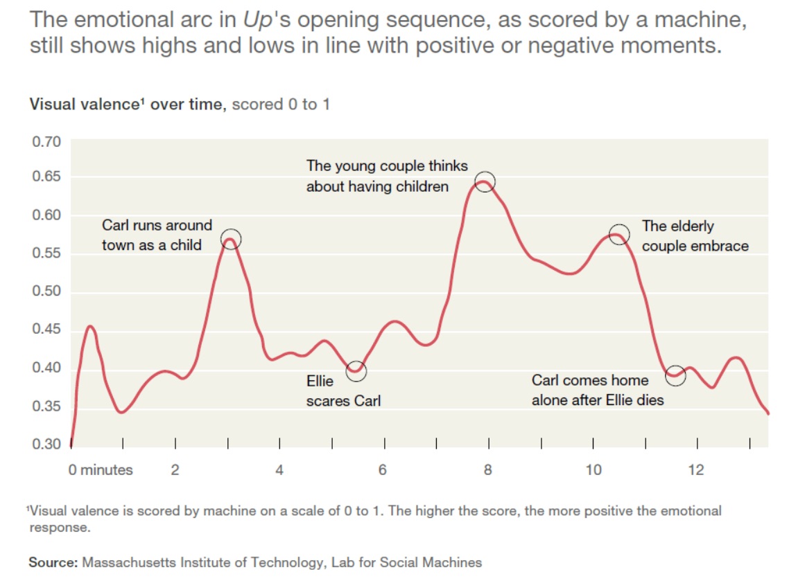 Carl 和 Ellie 的一生,看看 AI 分析得对不对 也就是说,这项 AI 技术可以更为准确地分析观众的笑点和泪点,这对影视制作方来说十分有利。 据悉除了让机器观看视频,研究人员也招募了志愿者来手动为视频中的不同片段标注「情感标签」。