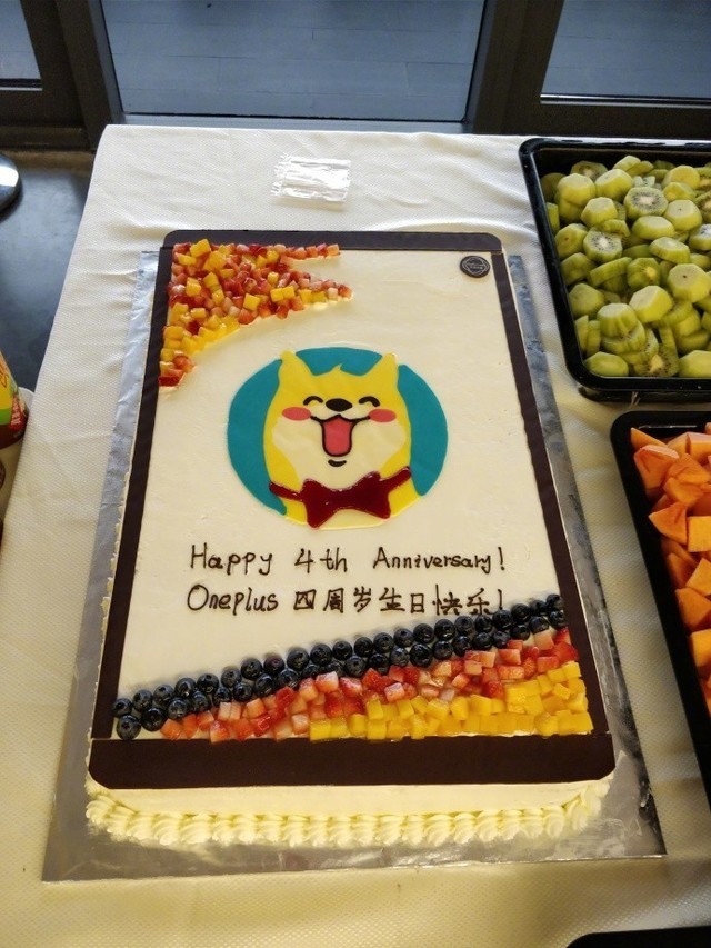 中关村在线:12月17日是一加手机成立四周年的日子,一加手机CEO刘作虎在刚刚发布微博晒了庆祝的方式。可以看到一加本部的办公室里已经有了节日的气氛,一个特大的蛋糕中央画着一加吉祥物,并且写着“Oneplus四周岁生日快乐”,旁边还摆放了各种水果。