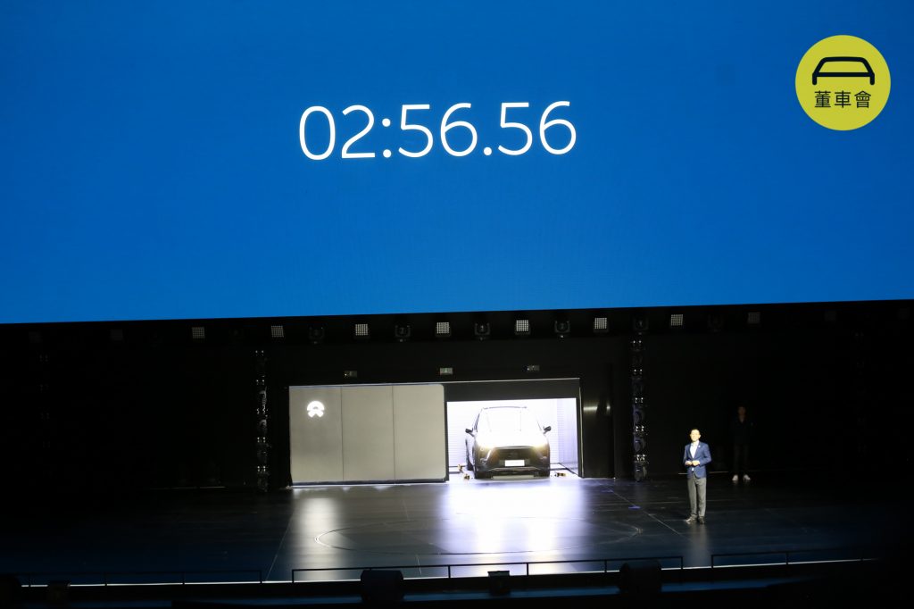 蔚来的换电装置占地约三个车位,可以在短短 3 分钟之内完成整个换电工作。发布会现场演示时的实际耗时,仅为 2 分 56 秒 56。