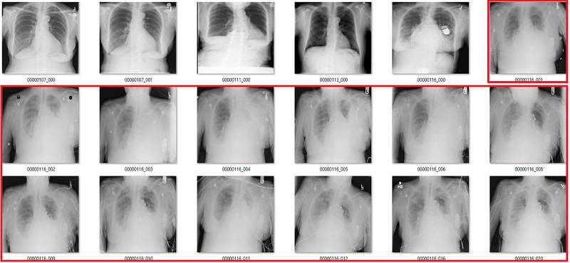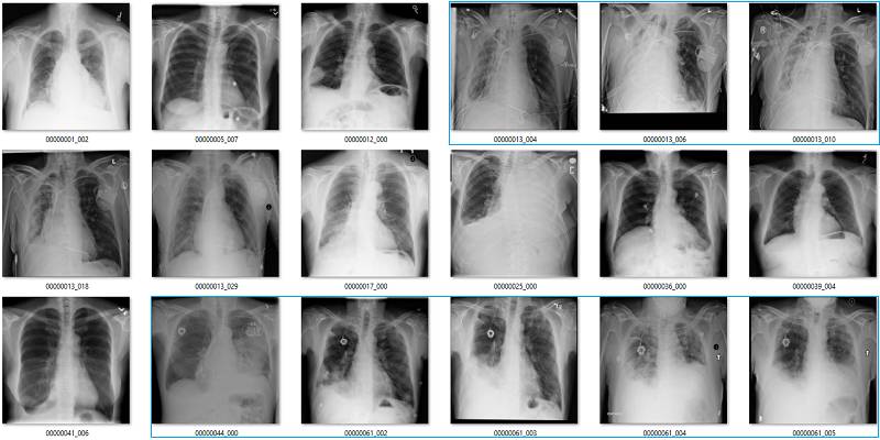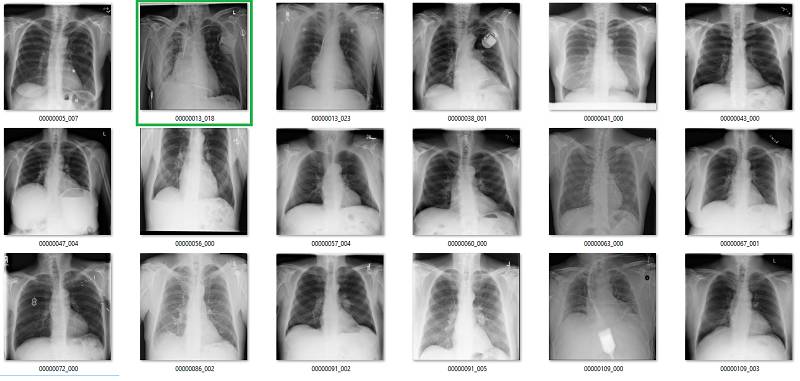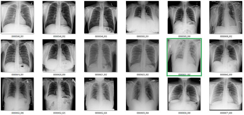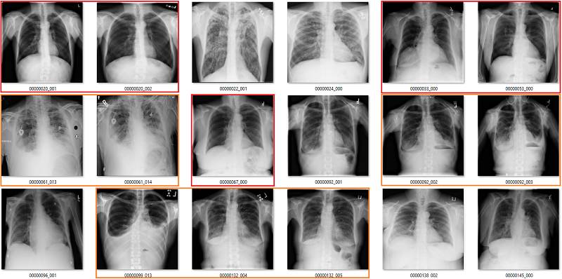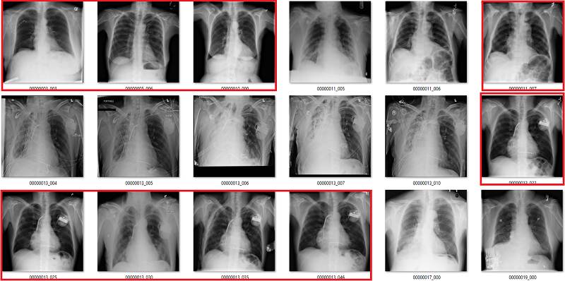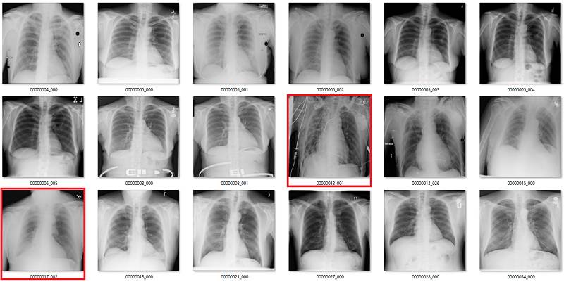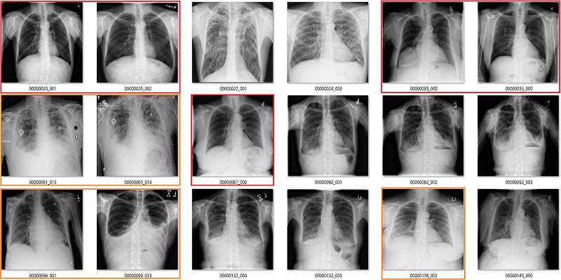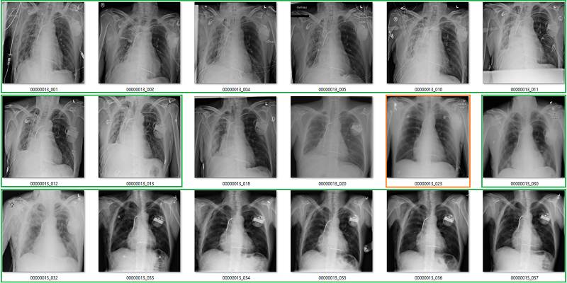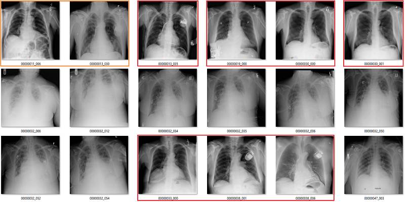 初次看来,标签似乎非常有效。在这 18 个样本中,只有用橙色标出的那张影像有点问题,这也可能是因为我没在诊断环境下查看肺部影像的原因。
