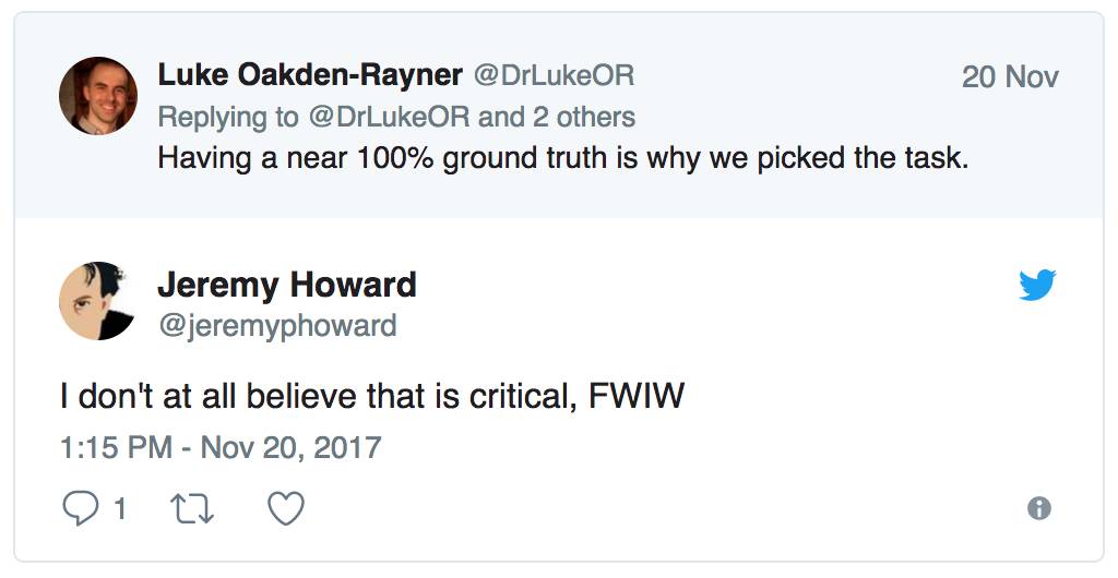 这篇论文稍微超出了本篇讨论的范围,因为和使用 ChextXray14 一样,他们需要人类医生对测试集之一(即他们声称和人类作比较的数据集)进行可视化检查并标记图像。这种策略大概可以解决上述我列举的大部分问题。