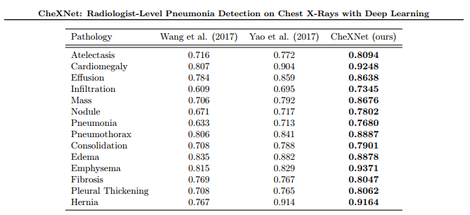 CheXNet(Rajpurkar and Irvin et al.)是吴恩达和他在斯坦福大学的团队建立在 ChestX-ray14 数据集之上的研究,因声称该模型在胸透检测肺炎的表现「超过放射科专家」而受到社交媒体的广泛关注。如下图所示,吴恩达本人表示: