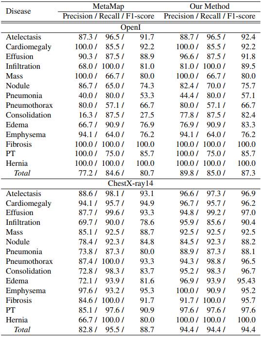 而列表中下面的部分是 ChestX-ray14 自己的数据,这个部分自从论文的第一个版本以来一直存在。为了制作测试集,研究人员随机选择了 900 份报告,并有两位注释者(在这里我们假设他们都是专业的放射科医师)进行标注,他们共同分类了其中的 14 种疾病。这里需要注意的是,这些注释者并没有直接检视图像(据我所知)。