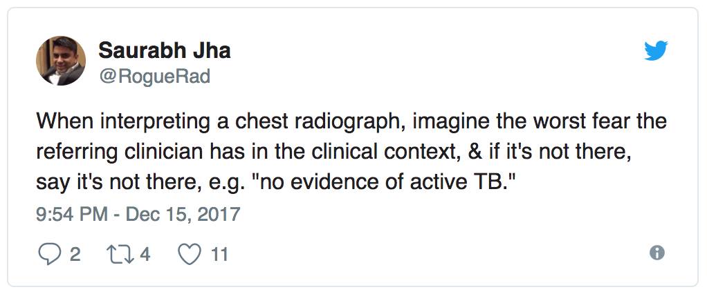 当解释胸部 X 光片时,想象一下临床医师面临的最大恐惧是什么,& 如果它不在,就说它不在,比如「没有活性 TB 的证据」。