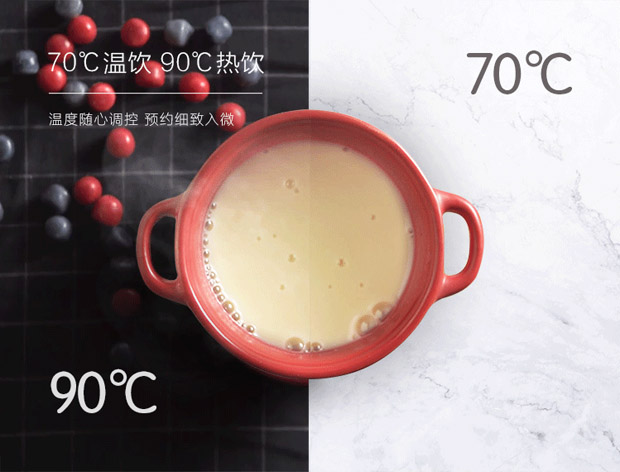 豆浆机微电脑液晶触摸屏大面板,界面上可一键设置生磨豆浆、生磨豆花、婴儿米糊、咸肉粥、五谷豆浆、可可奶茶、玉米汁、果酱、奶昔等操作,并带有轻松洗自清洁系统。6-24小时预约,热饮温度则可设置65℃或者95℃。
