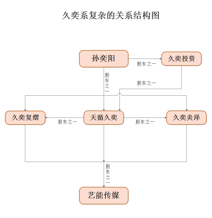 在说这件事之前,有必要先把涉及到的几家公司背景关系交代一下。经过文娱商业观察层层梳理发现,久奕复熠、久奕炎泽和天循久奕同时都是艺能传媒的股东,持有艺能传媒不同数量的股票,同时天循久奕又是久奕复熠、天循久奕的股东,关系相当复杂。