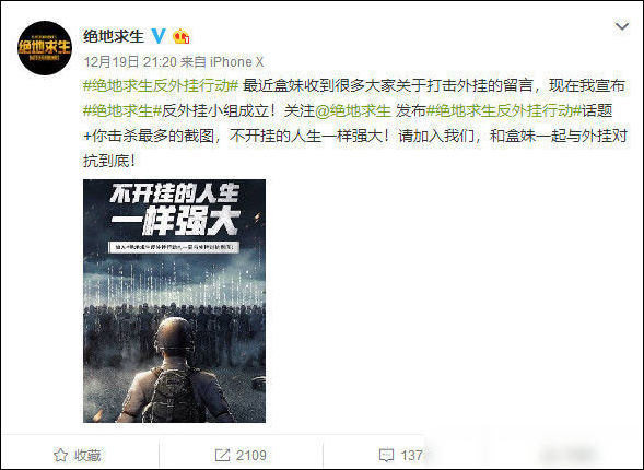 昨晚,腾讯《绝地求生》官微再次在 微博 上发布声明,宣布腾讯将成立“绝地求生国服反外挂小组”,并且打出口号:不开挂的人生,一样强大。号召广大玩家共同参与,维护公平的游戏环境。