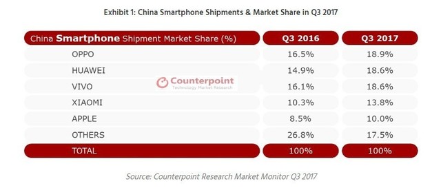 ②根据Counterpoint数据,中国市场前四手机品牌份额变化,2017年前三季度,OPPO份额持续上升;截止第三季度,OPPO第一,华为、vivo、小米分居二三四。