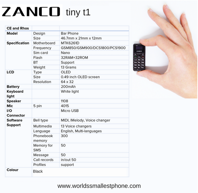 根据 SlashGear 的报道,Zanco tiny t1 的机身设计很简单,传统功能机的按键排布再加上一个 0.49 英寸的极小屏幕就填满了正面。机身底部附带了一个 microUSB 接口,这个接口基本上就占据了底部绝大部分的空间,在这里你就能够知道手机到底有多小了。