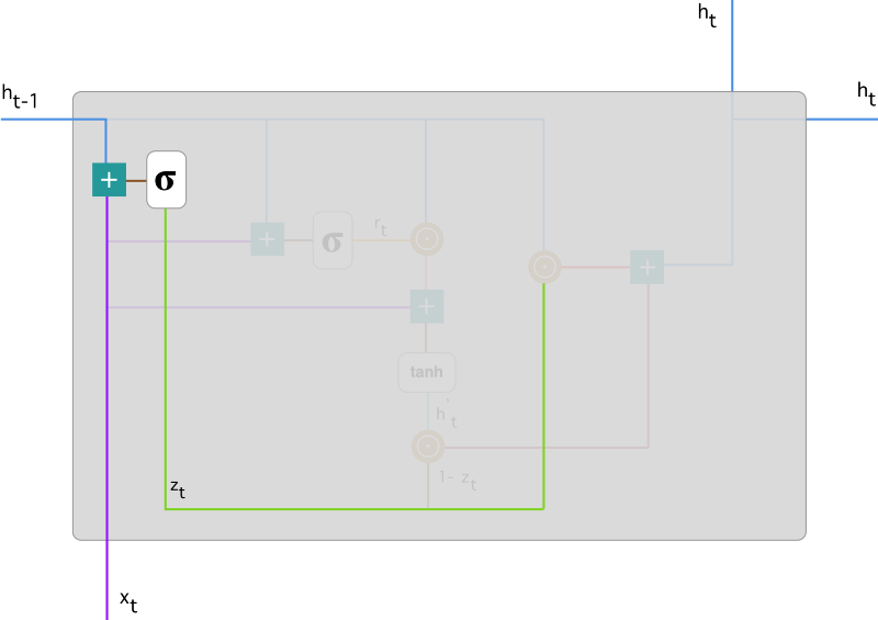 其中 x_t 为第 t 个时间步的输入向量,即输入序列 X 的第 t 个分量,它会经过一个线性变换(与权重矩阵 W(z) 相乘)。h_(t-1) 保存的是前一个时间步 t-1 的信息,它同样也会经过一个线性变换。更新门将这两部分信息相加并投入到 Sigmoid 激活函数中,因此将激活结果压缩到 0 到 1 之间。以下是更新门在整个单元的位置与表示方法。