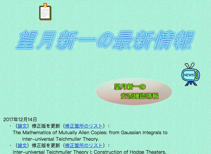 他在京都大学的个人主页上有个页面叫“望月新一の安否確認情報”,此刻最新一条是“17年12月12日の6時現在、健在であることを記している。”对于一个宅而言这真是非常实用的功能……(另一方面,也许此刻他已经死了十多天了没人知道。)
