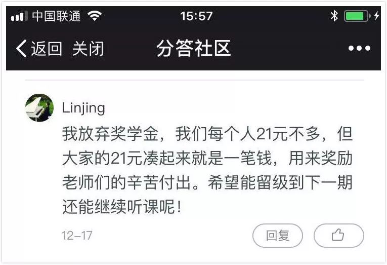 有做到21天坚持打卡的学员,为了感谢陈华伟的付出,主动放弃领取课程返还的21元“打卡奖学金”。