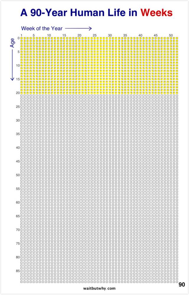 假设你能活到90岁,用1个小方格代表1个星期,那1张A4纸就足够容纳你的全部人生。