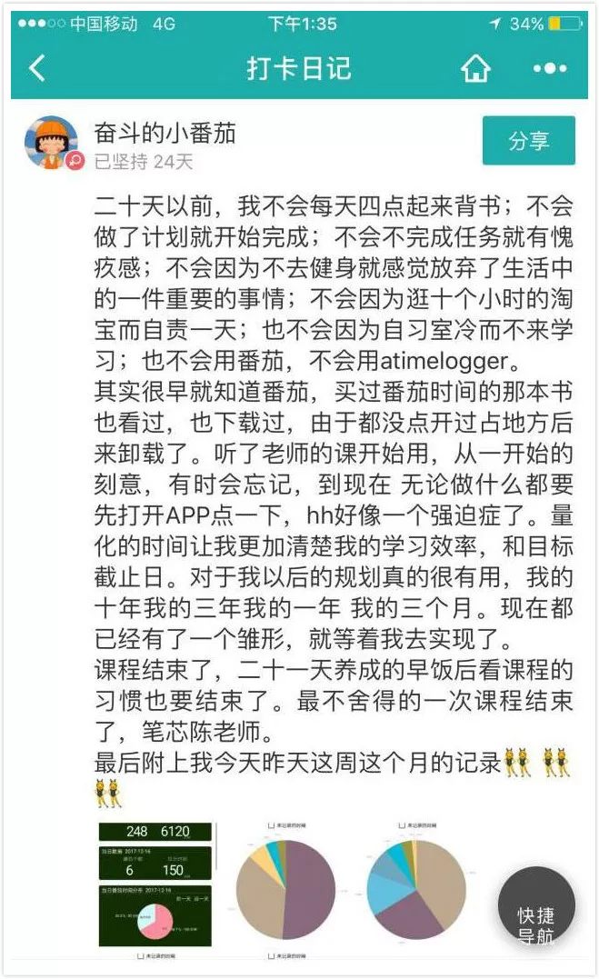 现在她每天都会用陈华伟总结的3 things和纸面任务管理方法,安排自己每周、每天的任务,并给每个任务预设番茄时间,起床写目标、晚上简单复盘,大部分任务都能在deadline之前完成。“我现在明白了,自己以前焦虑的根源是对时间、生活没有把控,现在利用华伟老师介绍的工具和方法,我对每天的时间安排都能做到心里有数,重新掌握了自己的生活”,她说。