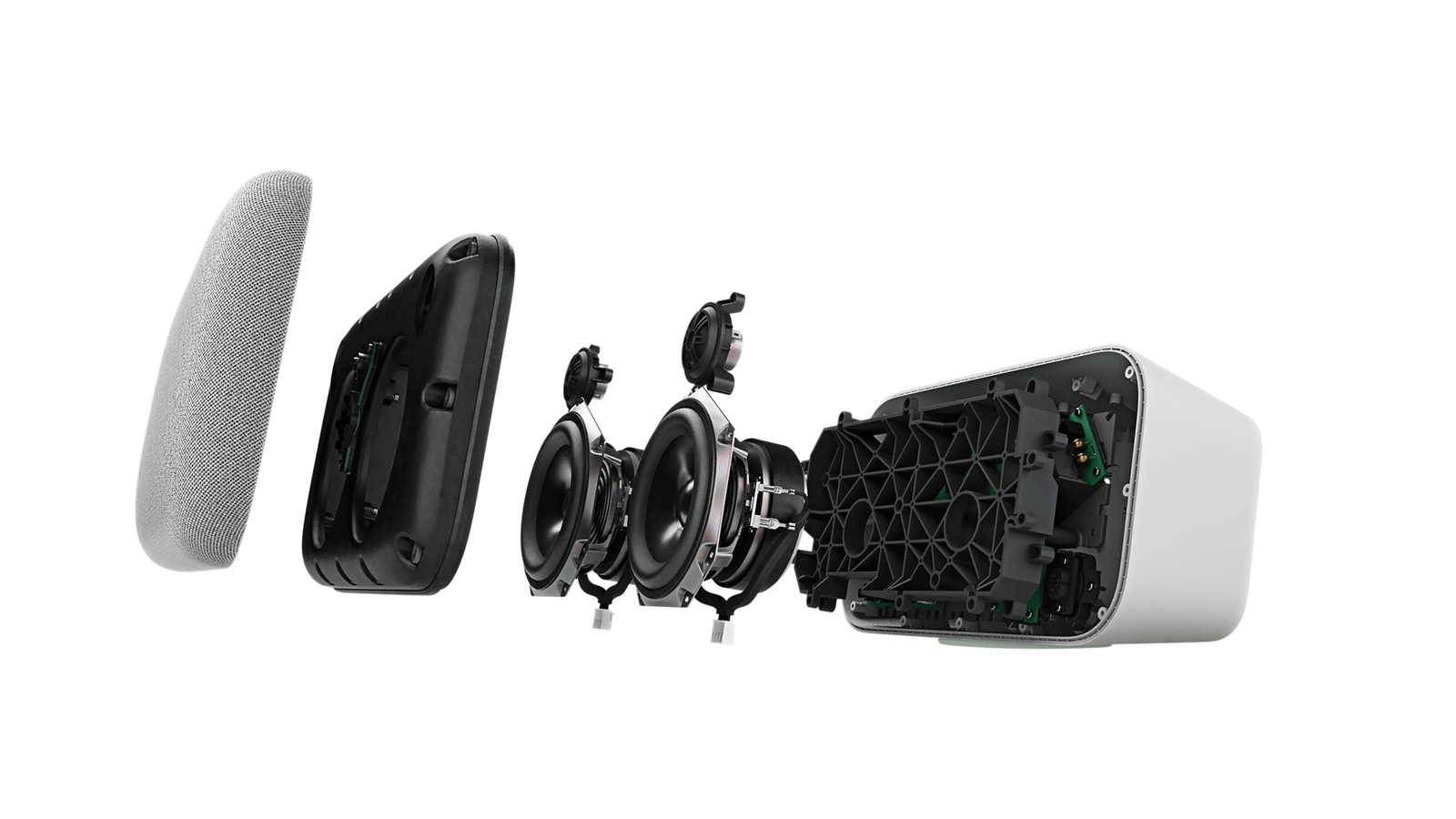 作为一款“Build for Sound”的智能音箱,Google Home Max 搭载了一组 4.5 吋低音单元,也加了 3.5mm AUX 音频接口。对比其他体积小巧的智能音箱,Google Home Max 确实有更大的空间和声音结构,要做好声音体验的话确实也有更大的优势。