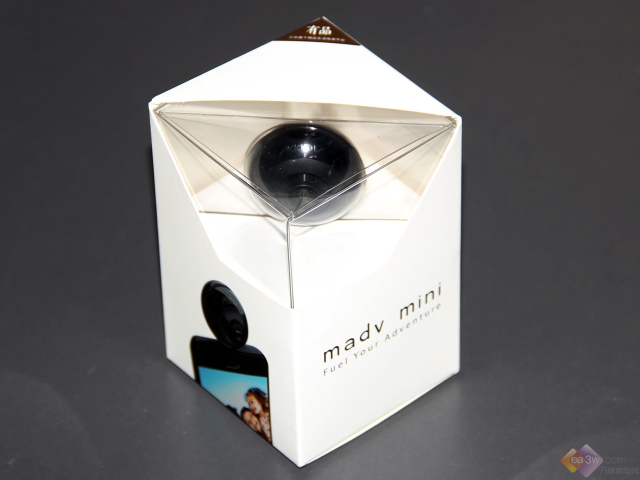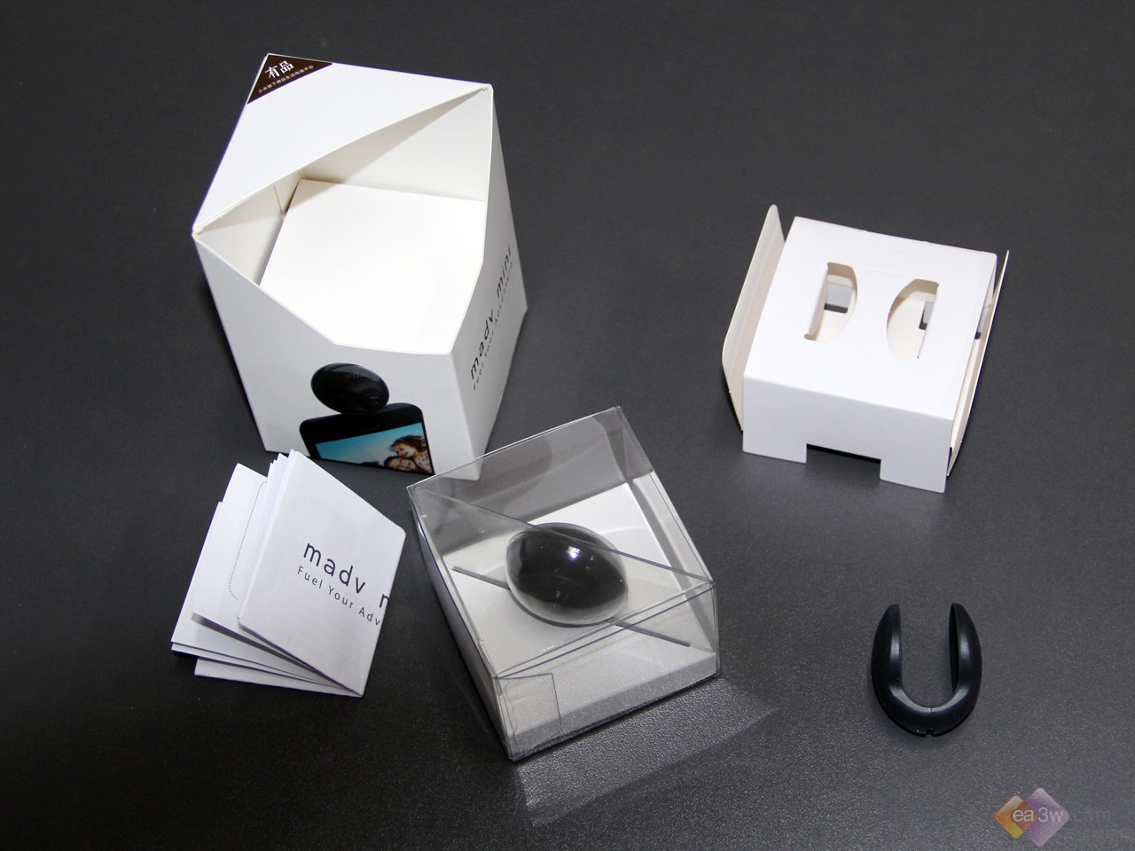 首先,MADV Mini全景相机的包装盒并不大,顶部就可以看到它的真身了,想一个椭圆形的小眼睛。
