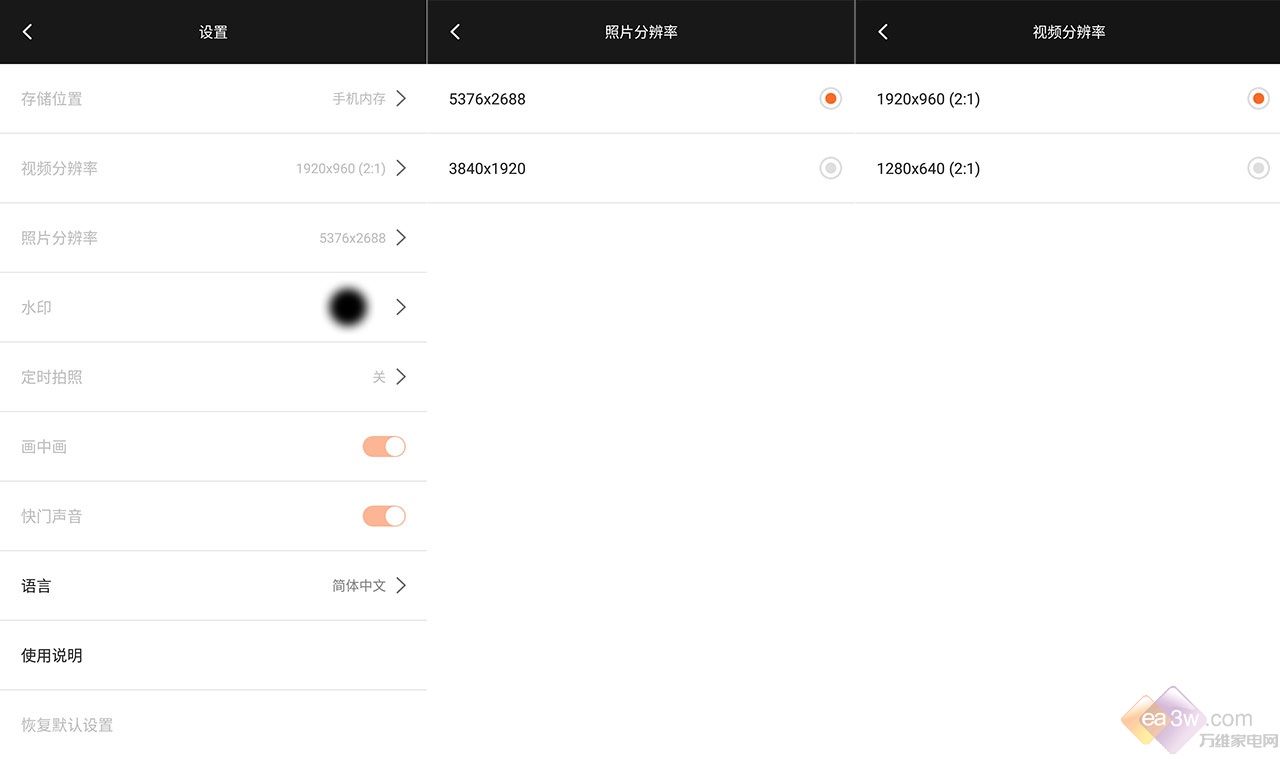 进入可以对于先在设置菜单当中对一些基本操作进行设置,比如存储位置、水印效果、快门声音等,从分辨率可以看到MADV Mini全景相机目前支持5K的照片和2K的视频,如果你仅仅是手机浏览观看,效果还是非常不错了。目前市场上很多类似的全景相机,照片仅3K,价格比MADV Mini还要高。