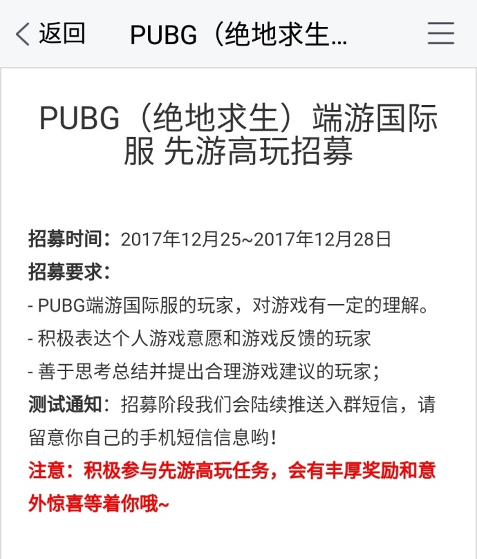 腾讯近日发布「PUBG(绝地求生)端游国际服 先游高玩招募」调查问卷,其中询问了玩家的国际服游戏时长,最近一个月的游戏数据等信息,符合条件的玩家将收到入群短信。官方还称积极参与先游高玩任务,会有丰厚奖励和意外惊喜。