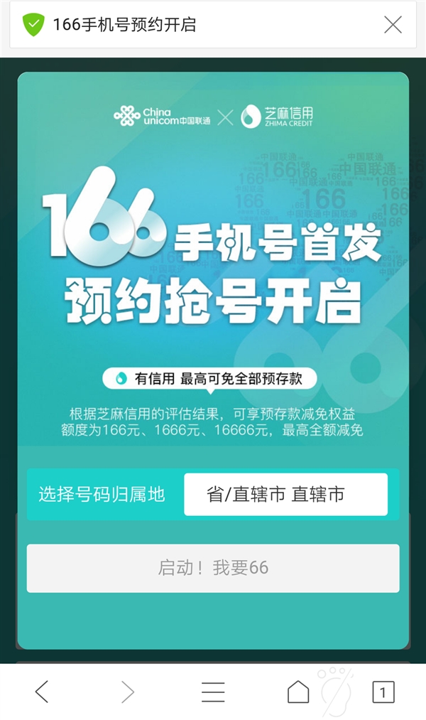 昨晚联通 166 号段正式启用,首批在全国投放百万个号码。预约页面显示,全国所有省份均已经可以选号入网,预约截止到 1 月 7 日,1 月 8 日开始办理,办理则截止到 1 月 15 日。此次联通 166 首发预约还和芝麻信用合作,可享预存款减免权益,额度为 166 元、1666 元、16666 元,最高全额减免。