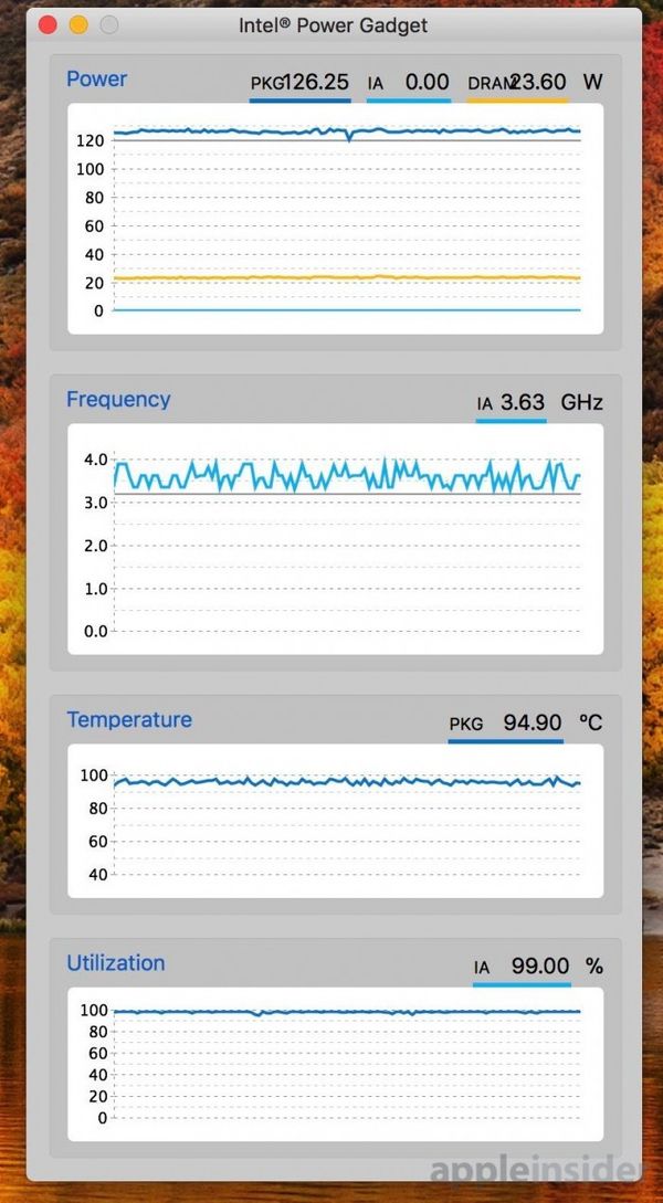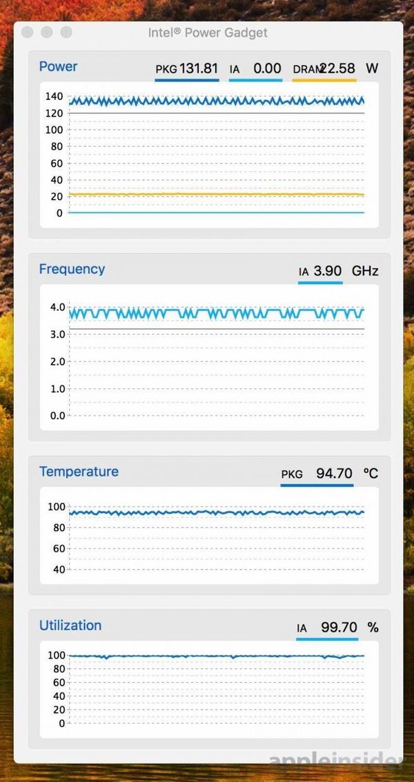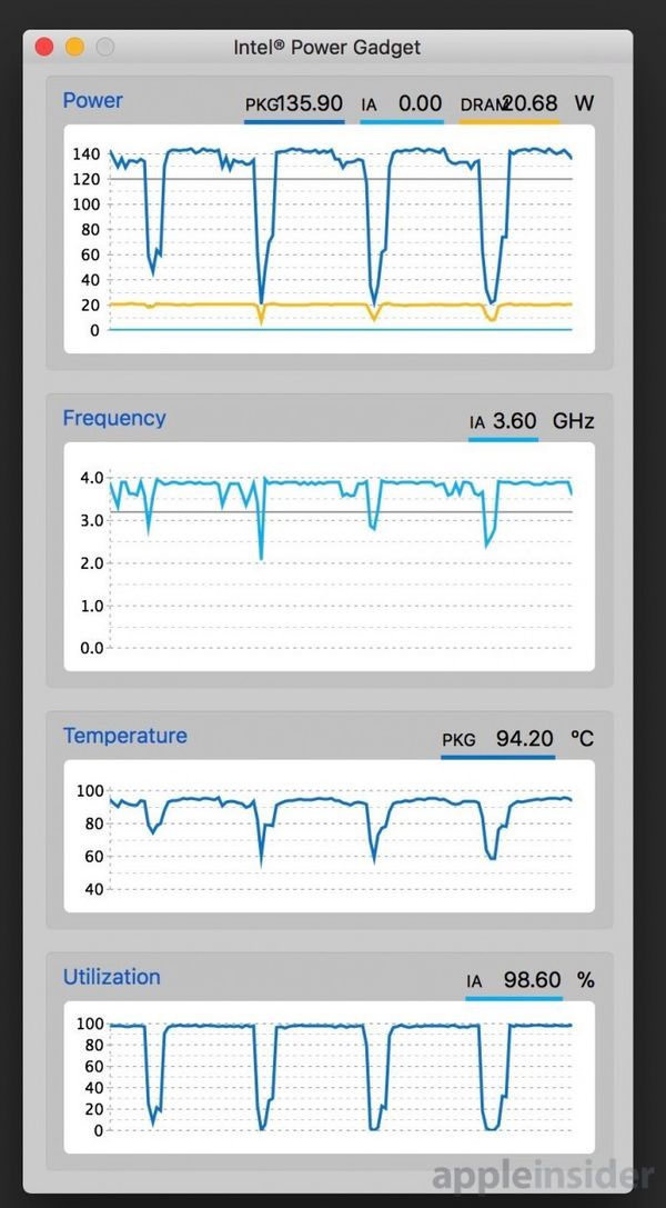 第二项测试是查看i Mac Pro 何时进行降频。测试结果显示当CPU温度达到94摄氏度的时候iMac Pro就会进行降频,然后在3.9GHz和3.6GHz之间进行切换。一旦CPU温度低于92摄氏度,那么时钟频率就会重新回归到3.9GHz最大频率。