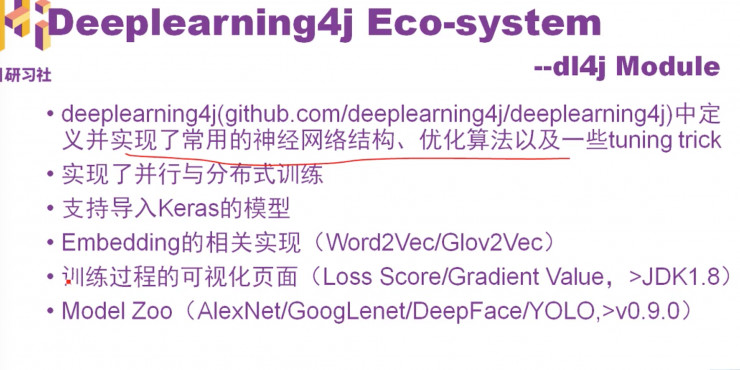 第二部分为DL4j的生态圈,主要介绍生态圈中最重要的三个模块:DL4j本身,它所依赖的张量预算库ND4j、DL4j当中做数据ETL的库DataVec。