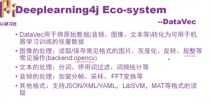 数据ETL库,称之为DataVec, 它的主要功能就是把语音信号,图片文件,文本文档转化为张量形式,做数据ETL.