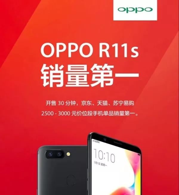 十一月份,OPPO R11s 上市,作为一款全方位升级的旗舰手机,其销量同样不俗。双 11 当天开售仅 30 分钟,就夺得天猫、京东和苏宁三个平台的 2500 元~3000 元档次单品销售冠军的头衔。