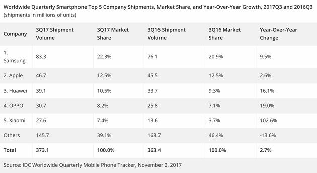在全球的市场表现方面,根据 IDC 在 11 月 3 日公布的数据显示,OPPO 手机靠着 8.2% 的市场份额,比去年同期增长了 1.1%,拿到全球第四的位置。OPPO 在 2017 年第一季度的出货量为 1890 万台,第二季度为 2780 万台,第三季度为 3070 万台,前三个季度销量合计 7740 万台,如果不出意外其出货量在 2017 年超过 1 亿台。