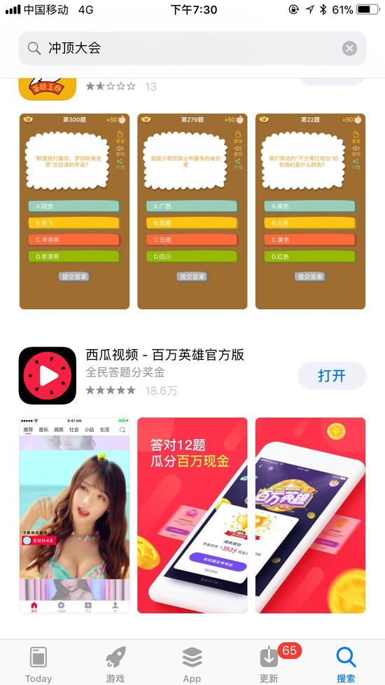在App Store搜索“冲顶大会”,我们会看到这样一个奇景: