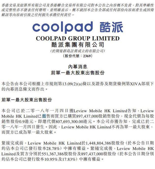 PingWest品玩1月5日报道,酷派发布公告称,Leview Mobile HK Limited告知已出售而买方已购买897,437,000股销售股份,现金代价为每股销售股份0.9港元,即总代价8.07亿港元,不再为单一大股东。2015年6月,乐视出资21.8亿元购买了酷派18%的股份,一跃成为第二大股东。