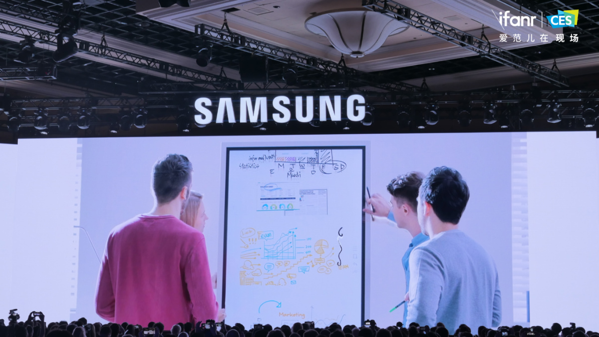 和电视一样,用户也可以实现对其它智能家电的操作,Bixby 当然也被深植其中。 在现场的演示中,两位工作人员分别向冰箱“打招呼”,Bixby 能很快识别出两位的声音,并在屏幕上显示出两人各自的日程。 或许在三星看来,能够成为智能家居中枢的,不应该只是一个设备。 Samsung Flip 电子白板