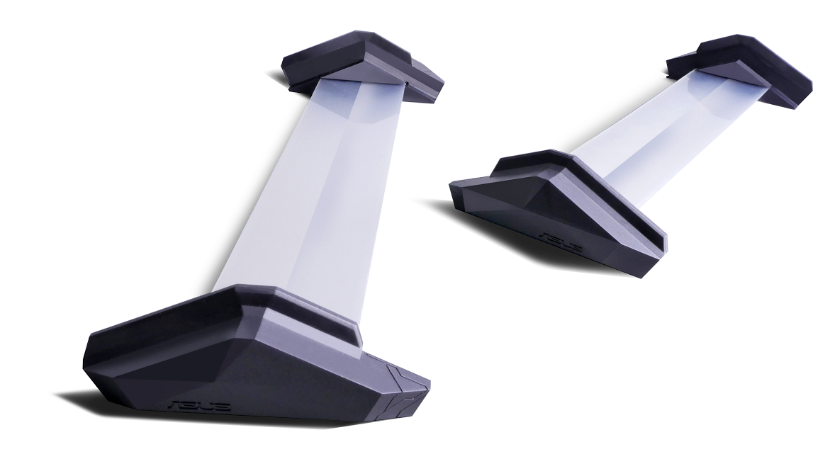 「ROG Bezel-free Kit」的构成也很简单,主体是矩形的透镜条,两侧是卡口。可以 130 度的角度安装在显示器的拼接处,在遮挡边框的同时,将两侧显示器上的屏幕图通过折射显示在透镜条上,就相当于把两台显示器「无缝连接」了。