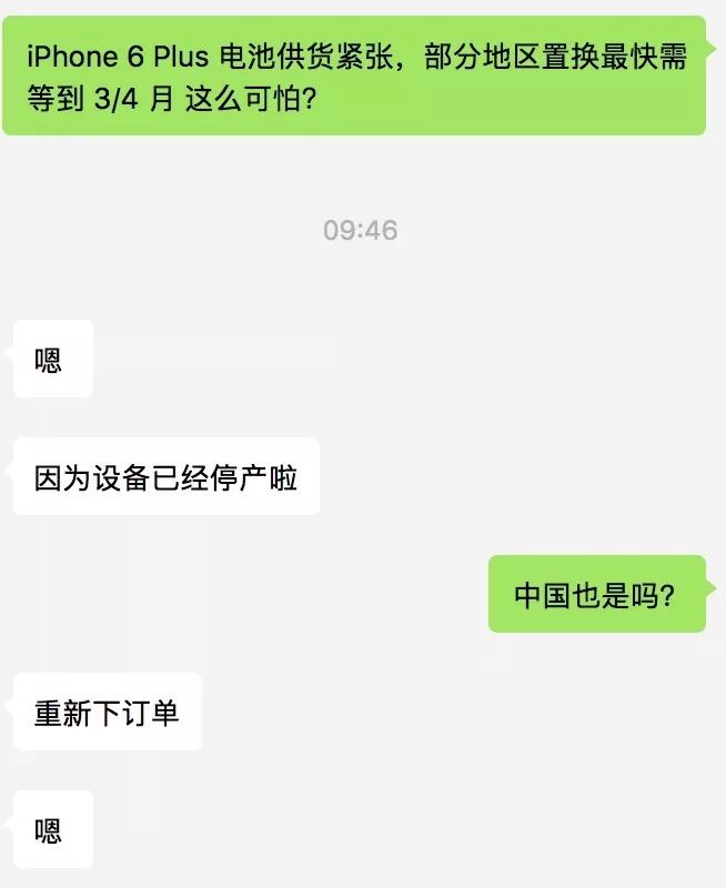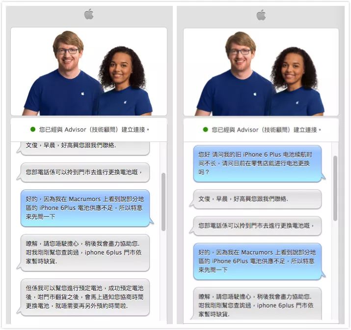 苹果(香港)的客服代表回复 同样地,苹果(中国大陆)的客服代表也作出了类似的回复,门店内目前仍然未能提供 iPhone 6 Plus 的电池更换服务,该机型更换电池需要提前进行预约。