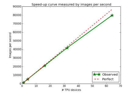 用 ImageNet 训练 ResNet-50 的实验结果表明,随着 TPU 数量增加,性能增加也几乎是理想线性的