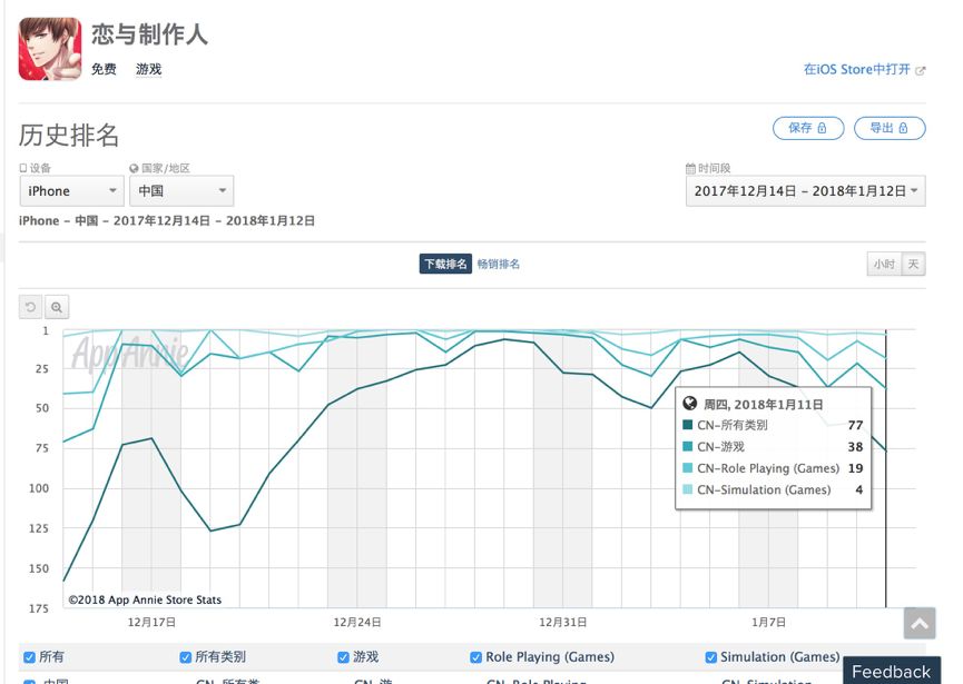 持续的生命力和昙花一现的话题感。《恋与》发布以后,可以说数据方面极其好看,游戏套路并不新颖但是却很精准的抓住了妹子们的内心,就希望有这样的纸片老公来安慰内心。但是总体排名极其不稳定,下图是APPANNIE的排行榜,可以看出,这款游戏在公关猛烈的时候话题性高的时候下载量就高,但是沉寂以后就一蹶不振,这也间接说明这类IP作为快消品的生命力太脆弱,而且问题是,你不能一直保证花钱去炒作啊。