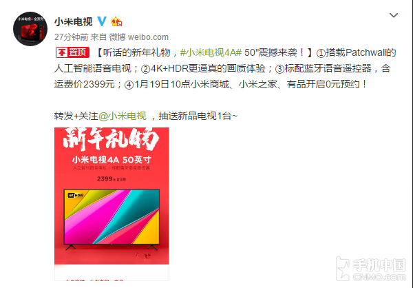 小米电视官方微博表示:“听话的新年礼物,小米电视4A 50"震撼来袭!①搭载Patchwall的人工智能语音电视;②4K+HDR更逼真的画质体验;③标配蓝牙语音遥控器,含运费价2399元;④1月19日10点小米商城、小米之家、有品开启0元预约!”