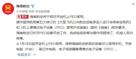 继东航之后 ,海南航空也宣布, 将于1月18日起开放机上便携式电子设备(PED)使用 。