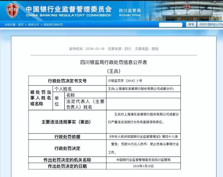 据了解,王兵曾任浦发银行成都分行行长,四川银监局的处罚理由为:王兵对浦发银行成都分行严重违法违规行为负有直接领导责任。具体处罚内容包括两条,1是警告,罚款50万元人民币;2是禁止终身从事银行业工作。