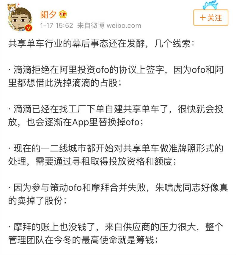年关将至,摩拜与ofo账上资金都不充裕,而更重要的是,资本与创业者的关系变得非常微妙。巨头对他们的态度,已经从开始的疯狂押注,逐渐变成了迁延观望。甚至,想要重新扶植一个新的、更听话的品牌。
