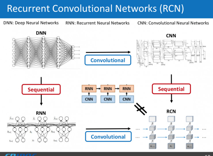 再来介绍一下循环卷积网络,它其实是一个全卷积的循环网络。以上图为例,对于传统的全连接深度神经网络,把它进行全卷积化,即把所有的全连接都替换成卷积操作,就得到我们经常使用的卷积网络。沿着时间方向展开,深度神经网络就变成一个循环网络。而我所介绍的循环卷积网络本质上是一个全卷积的循环网络。这种网络在参数量上有巨大优势,传统循环网络的参数量大概是在百万甚至千万左右,循环卷积网络基本上只有一两万左右,因此测试速度会得极大的提升。